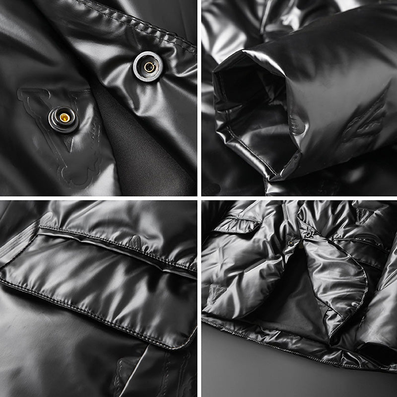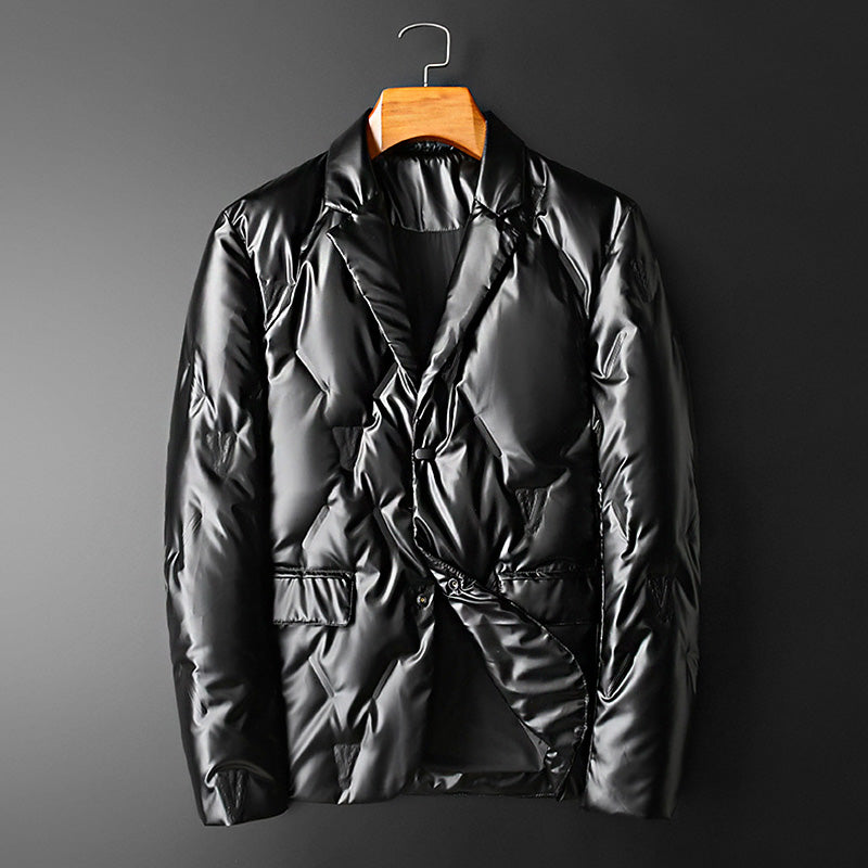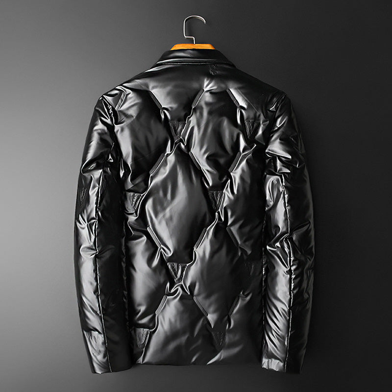 The James Scott Radiant Rave Jacket, with its unique structural diamond-shaped pattern and a subtle glossy finish, is designed to elevate your style to a whole new level. It catches the light just right, creating a subtle sheen that sets you apart in any crowd.